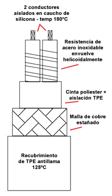 Material de aislación y cobertura: Caucho de silicona (apto para 180°C de temperatura de servicio)