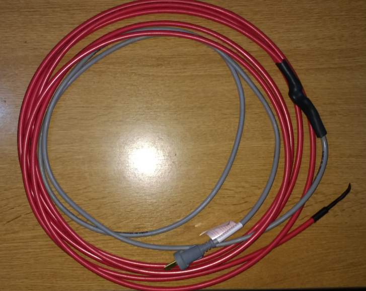 El conjunto está formado por un cable calefactor de potencia constante, tiene conectado un termostato NA para 5ºC, por debajo de esa temperatura, el circuito cierra energizando la resistencia.